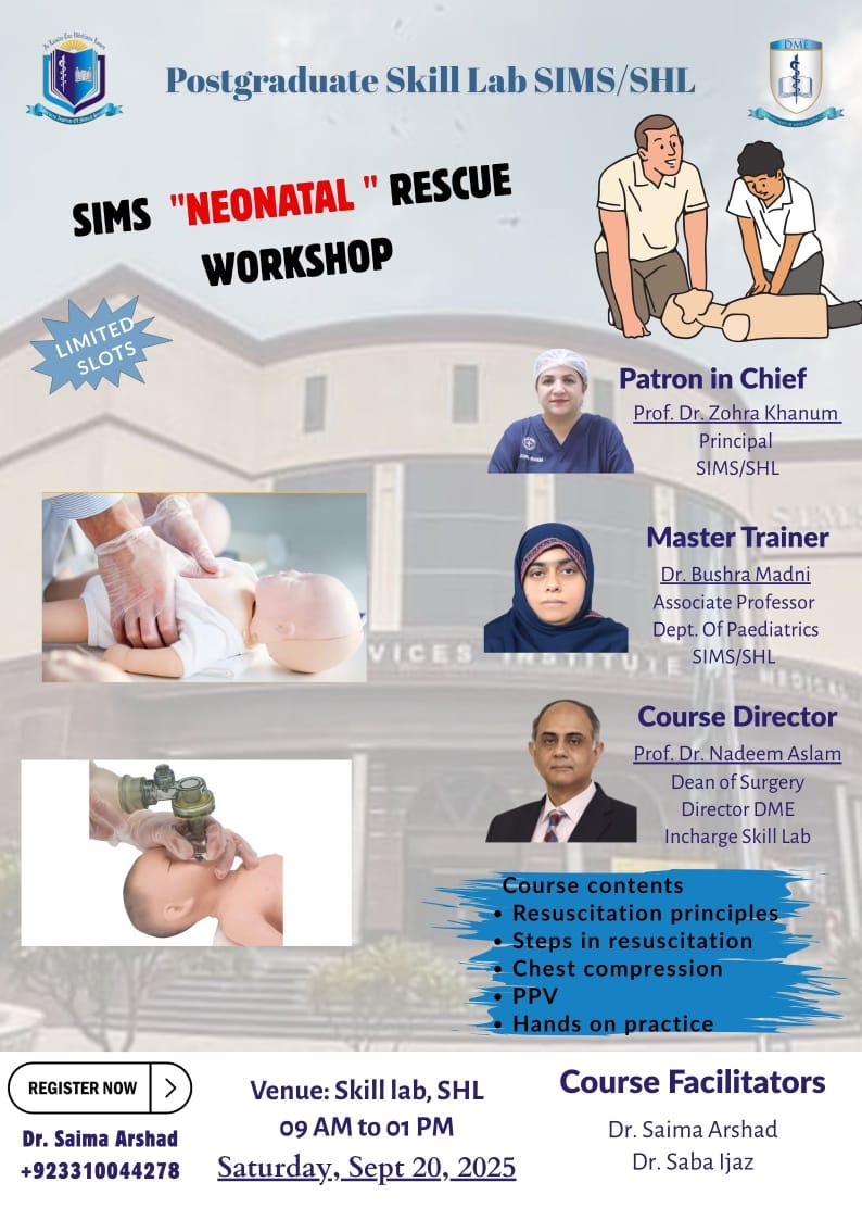 Today, SIMS Neonatal Rescue Workshop was successfully conducted at post graduate skill lab SIMS/SHL. The workshop was possible with unwavering support of Principal, Prof Dr Zohra Khanum, the Patron on Chief and Prof Dr M Nadeem Aslam (Prof of Surgery and incharge PG skill lab).